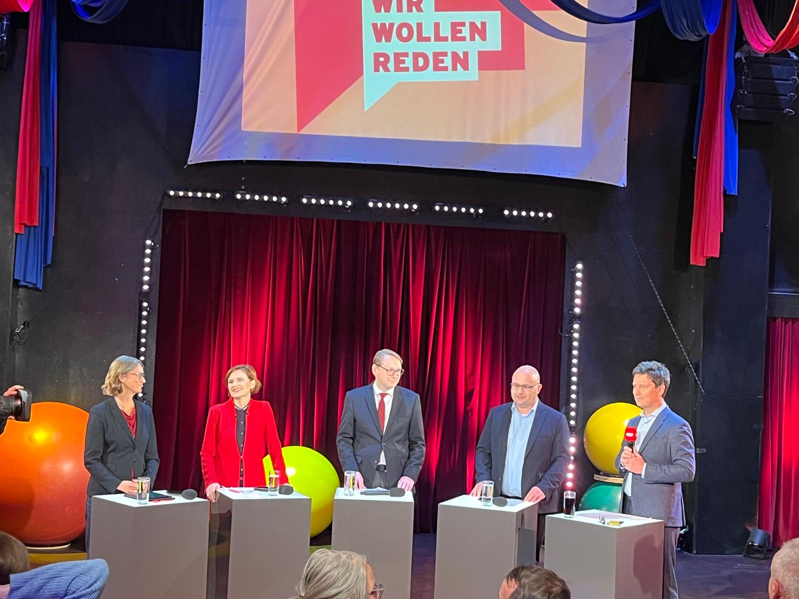 Moderator Sascha Hingst diskutierte mit Bürgerinnen und Bürgern im Publikum sowie mit Katja Kipping (Paritätischer Gesamtverband), Katja Karger (DGB Berlin-Brandenburg), Oliver Zander (Hauptgeschäftsführer von Gesamtmetall) und Prof. Stefan Kolev (wissenschaftlicher Leiter des Ludwig-Erhard-Forums für Wirtschaft und Gesellschaft).