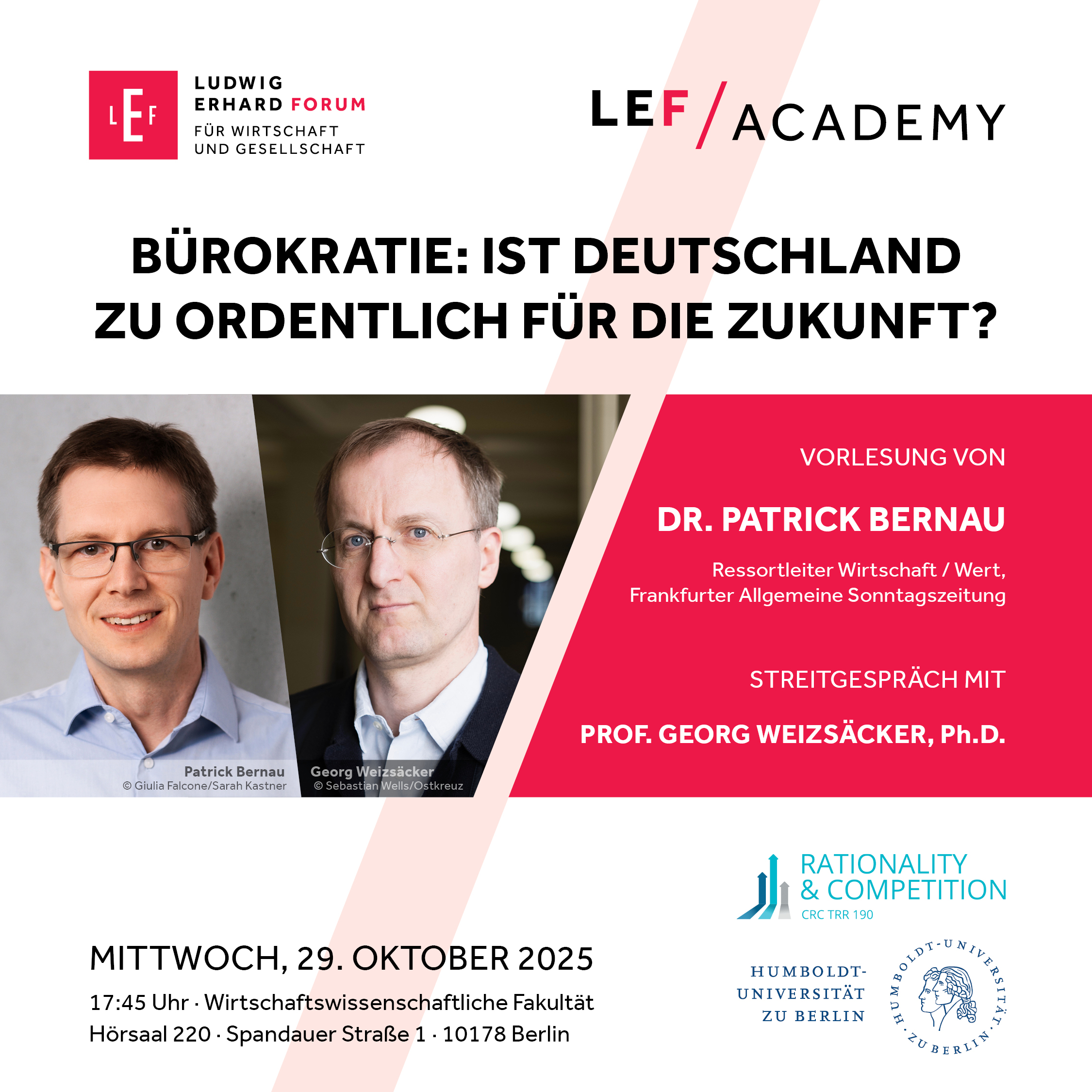 Mit der LEF ACADEMY haben wir eine akademische Vorlesungsreihe etabliert, die sich den Themen rund um eine moderne Ordnungsökonomik widmet. Ziel des Formats ist es, renommierte Persönlichkeiten aus Wissenschaft, Politik und Publizistik zu Wort kommen zu lassen, mit ihnen zu diskutieren, von ihren Impulsen zu lernen. Die Vorlesungen richten sich sowohl an ein einschlägiges Fachpublikum als auch an interessierte Studierende und dem wissenschaftlichen Nachwuchs aller sozial- und geisteswissenschaftlichen Fachrichtungen.